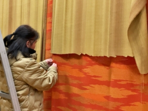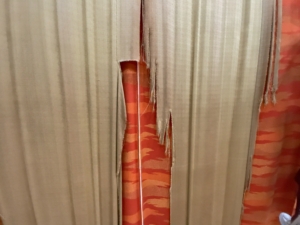 緞帳には、厚手の生地が使われていますが、長年の使用で裏地(うら側の薄い布)がぼろぼろになってしまっていました。