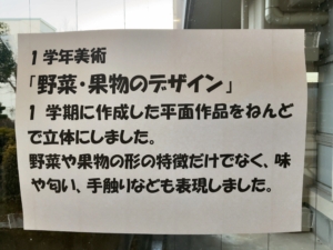 生徒昇降口に、1年生の美術の作品を展示しています。
