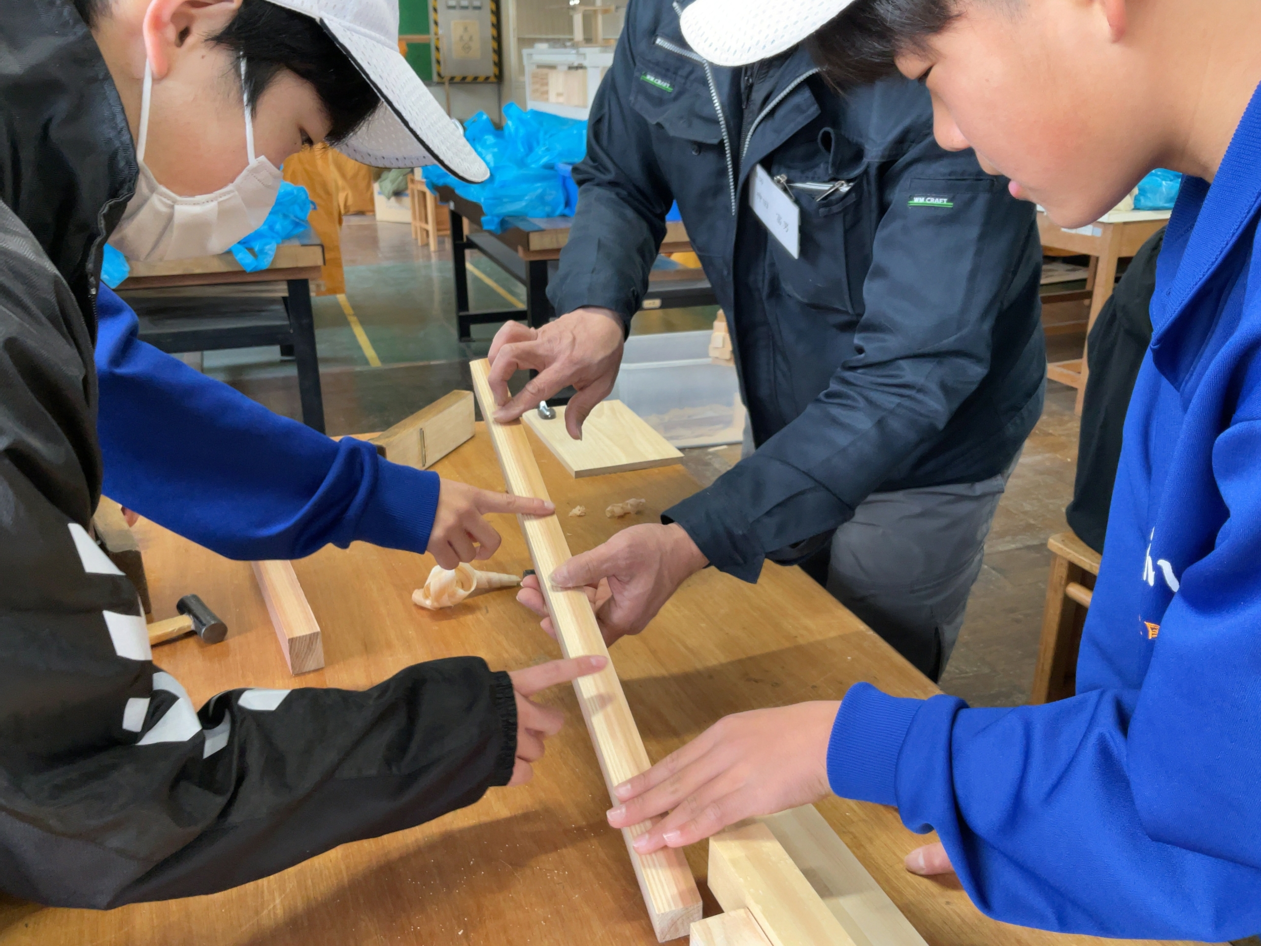 1年生の技術科の授業では、飯下建設組合の皆さんから、かんながけの極意を教えていただきました。 代表の片桐さんは、「プロの技を見て違いを感じてほしい。また、自分でやってみて、ものづくりに興味をもってもらえたらいい」と話してくださいました。 いざ、やってみると、プロのようにはいきません。 手の位置、腰の運び方など、極意を教わりました。 教室中に、ヒノキのよい香りが広がりました。