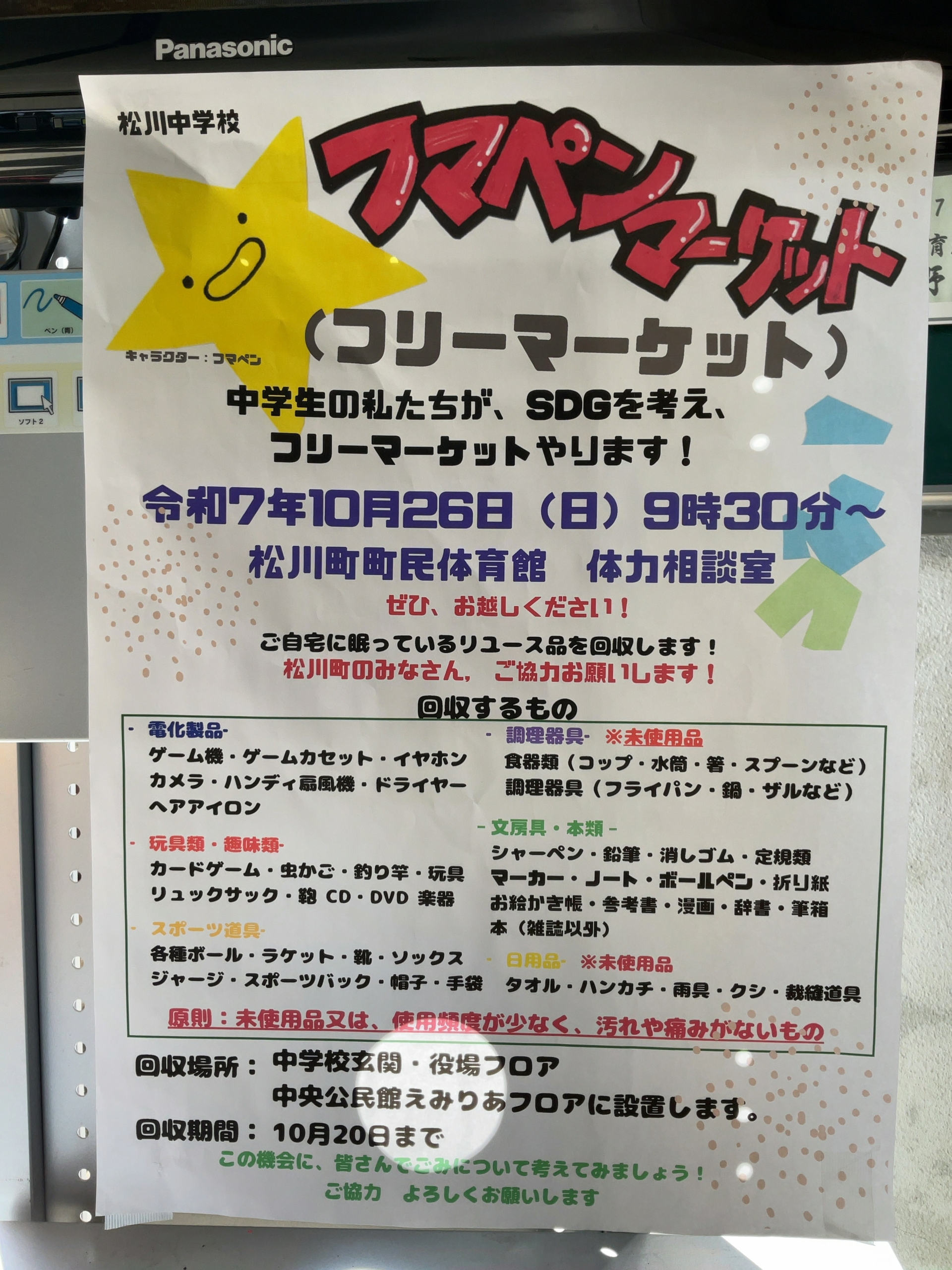 10月26日(日)9:30~、えみりあにて、松川町の文化祭が行われます。 そこで、本校3年生の総合的な学習の時間「SDGs・共生社会」チームが、フリーマーケットを行います。 学校の昇降口でCMを流し、物品を回収しています。 ご協力をお願いします!