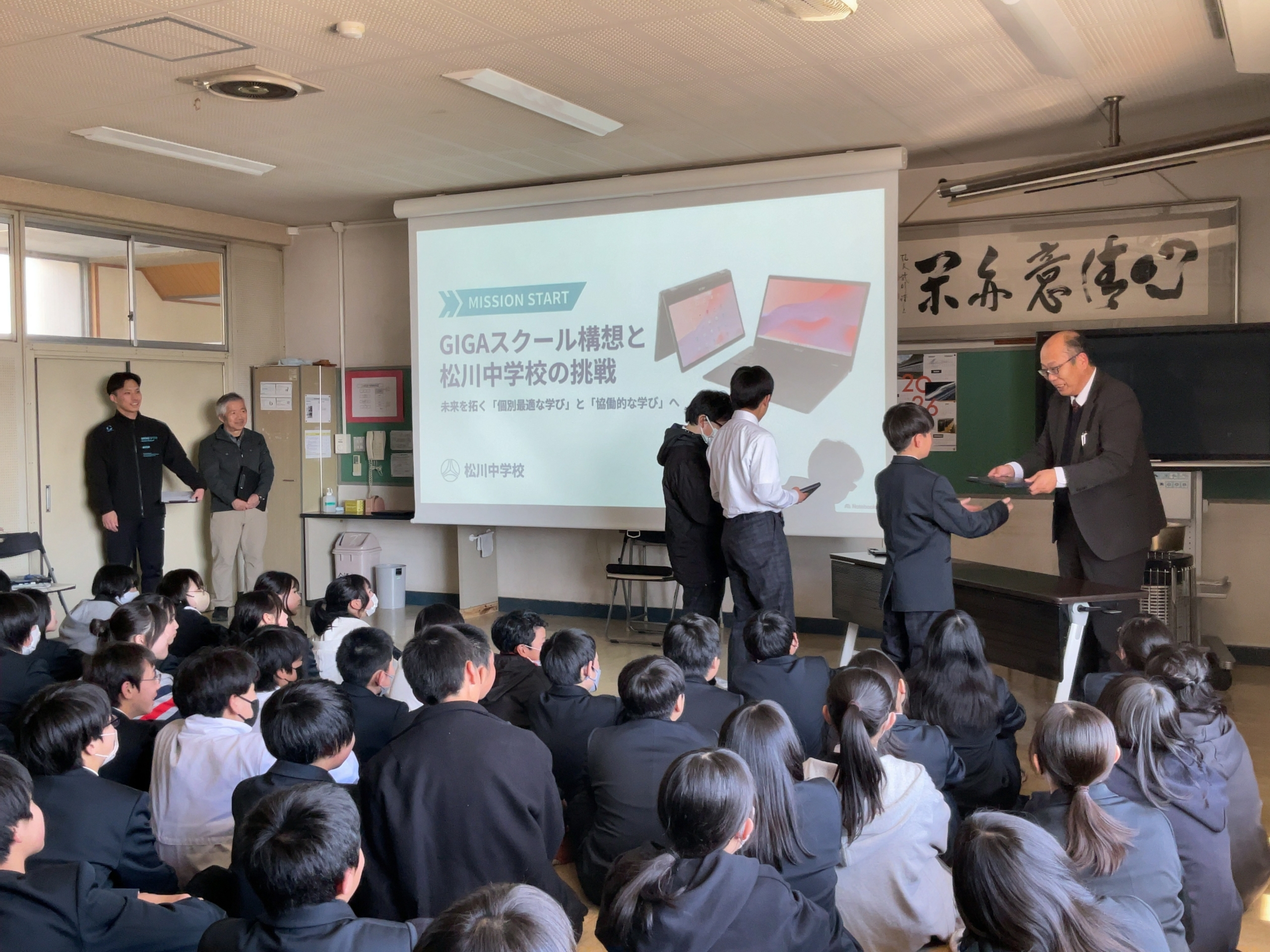 本年度最後の授業参観が行われました。 多くの保護者の皆様にご来校いただき、ありがとうございました。 松川中学校の授業参観では、廊下に張り出されたQRコードを読み取って、子供たちのワークシートをみ見ることできることが定番となりつつあります。 「これって、リアルタイムなの?」 3年生の教室の中では、ICTを使った社会科の授業が行われていました。 子供たちがリアルタイムに書き込む様子を「閲覧」画面から見る保護者さんたちから、驚きの声があがりました。 ICTの使い方も、どんどん進んでいきますね。