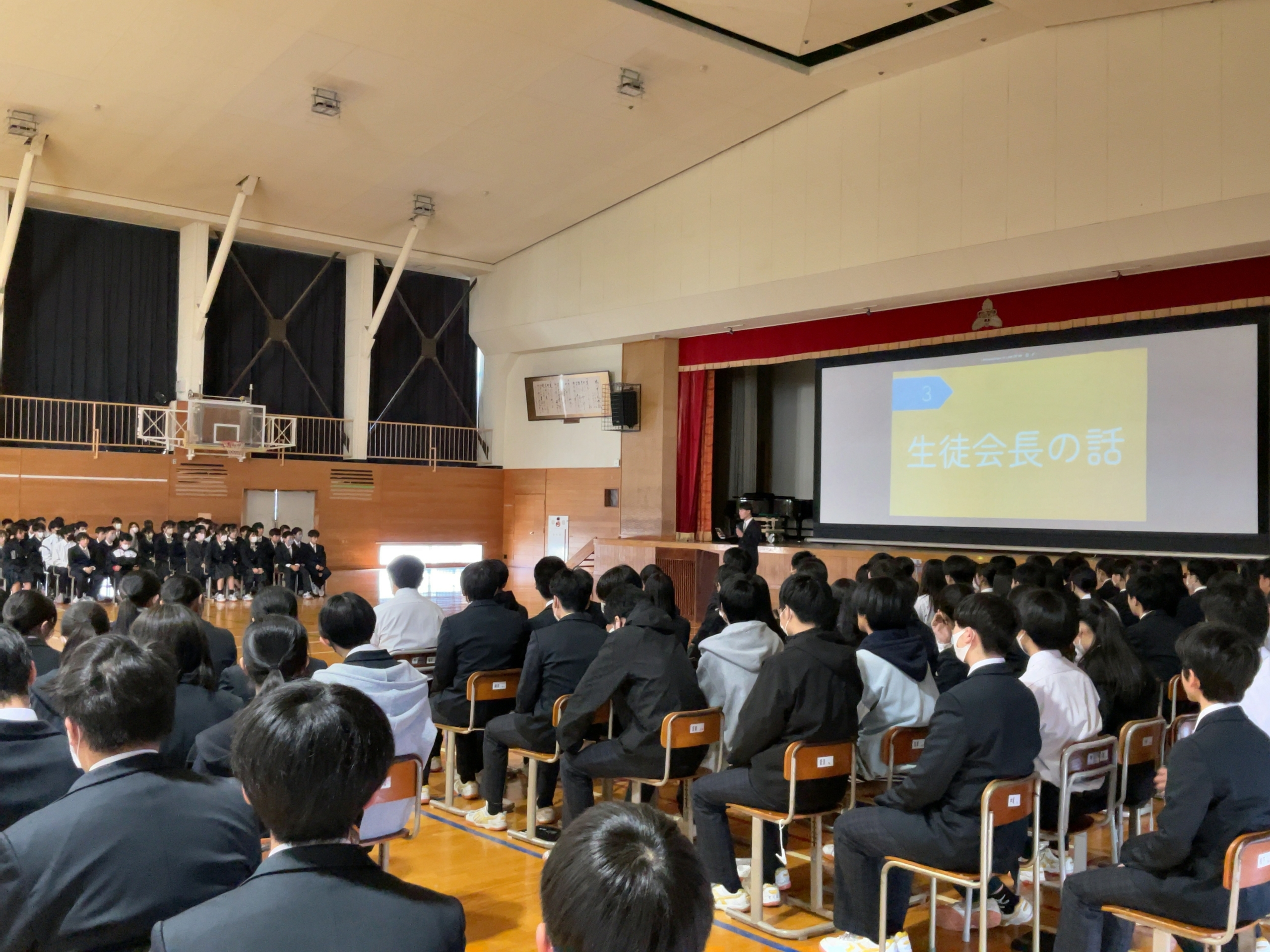 授業参観に引き続き、校長講話が行われました。 本年度の学校自己評価アンケートの結果に触れながら、来年度の方向についてお話して下さいました。 本年度は、どの質問項目に対しても、おおむねよい評価をいただくことができました。 地域の皆様、保護者の皆様から温かい支援、ご理解をいただき学校経営ができていることを有り難く思います。 課題点にも目を向けながら、これからもどの生徒にとっても安心して生活できる学校を目指します。 今後ともよろしくお願いします。 学校自己評価アンケートの詳しい結果は、後日家庭に配布させていただきます。