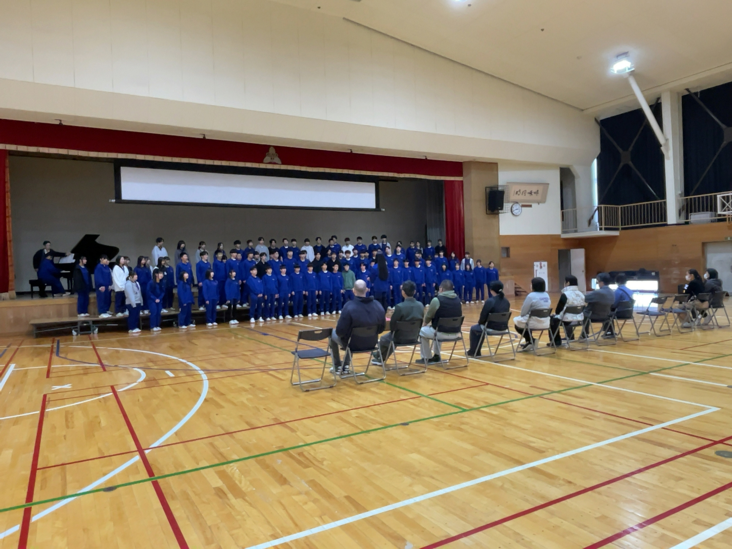 体育館のステージの緞帳(どんちょう)の裏側では、今日、こんな作業がなされていました。 緞帳には、厚手の生地が使われていますが、長年の使用で裏地(うら側の薄い布)がぼろぼろになってしまっていました。 少し触っただけでも、ちぎれてしまう状態です。 そこで、今日は業者さんにお願いして、「古い裏地を撤去」していただくとともに、「表地の裂けている部分を縫って」いただきました。 高い位置から吊られているので、撤去作業は足場を組んでの作業です。 このような陰のお支えのおかげで、今年度も卒業式が迎えられます。感謝。