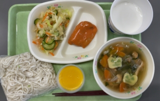 今日は、ハロウィン献立です。 献立は・・・ きつねうどん 鶏肉のマヨケソース 糸寒天のサラダ ハロウィンかぼちゃデザート です。マヨケソースとは、マヨネーズとケチャップでできています^^ 全て手作り、毎日おいしい松川中の給食です! ごちそうさまでした。